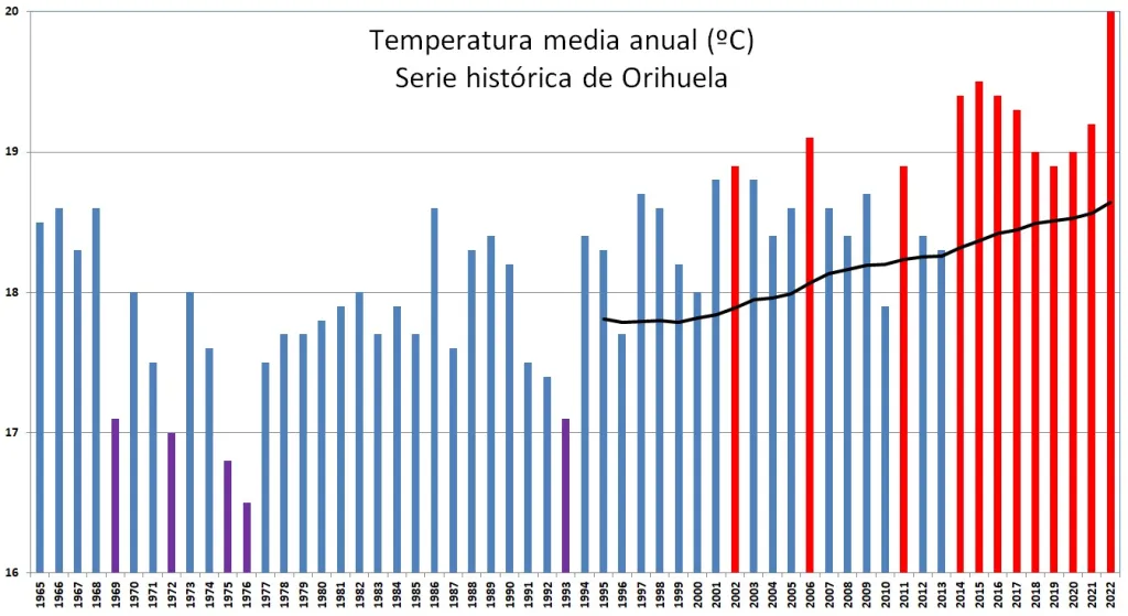 Tras la primavera de récord en cuanto a lluvias, el periodo mayo-diciembre de 2022 ha estado protagonizado por la persistencia de anomalías cálidas, provocando que este año sea con diferencia el más cálido desde que se toman registros en Orihuela. La tendencia hacia el aumento de las temperaturas es inequívoca, ya que los últimos 9 años se encuentran entre los más cálidos de la serie (como se muestra en color rojo en el gráfico). Estos datos pueden aplicarse legítimamente a toda la comarca de la Vega Baja.