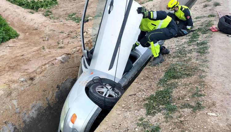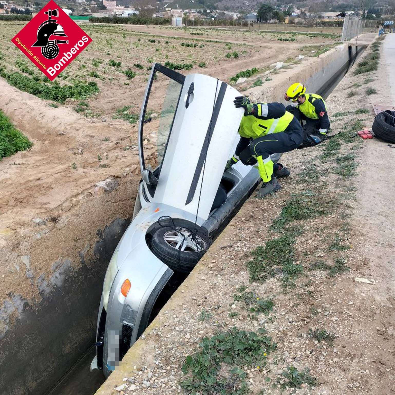 Orihuela fue escenario ayer de un grave accidente de tráfico, en el Camino de Enmedio, que requirió la intervención de los bomberos de Orihuela, quienes rescataron a un varón atrapado en un vehículo que se salió de la vía y quedó encajado en un canal.