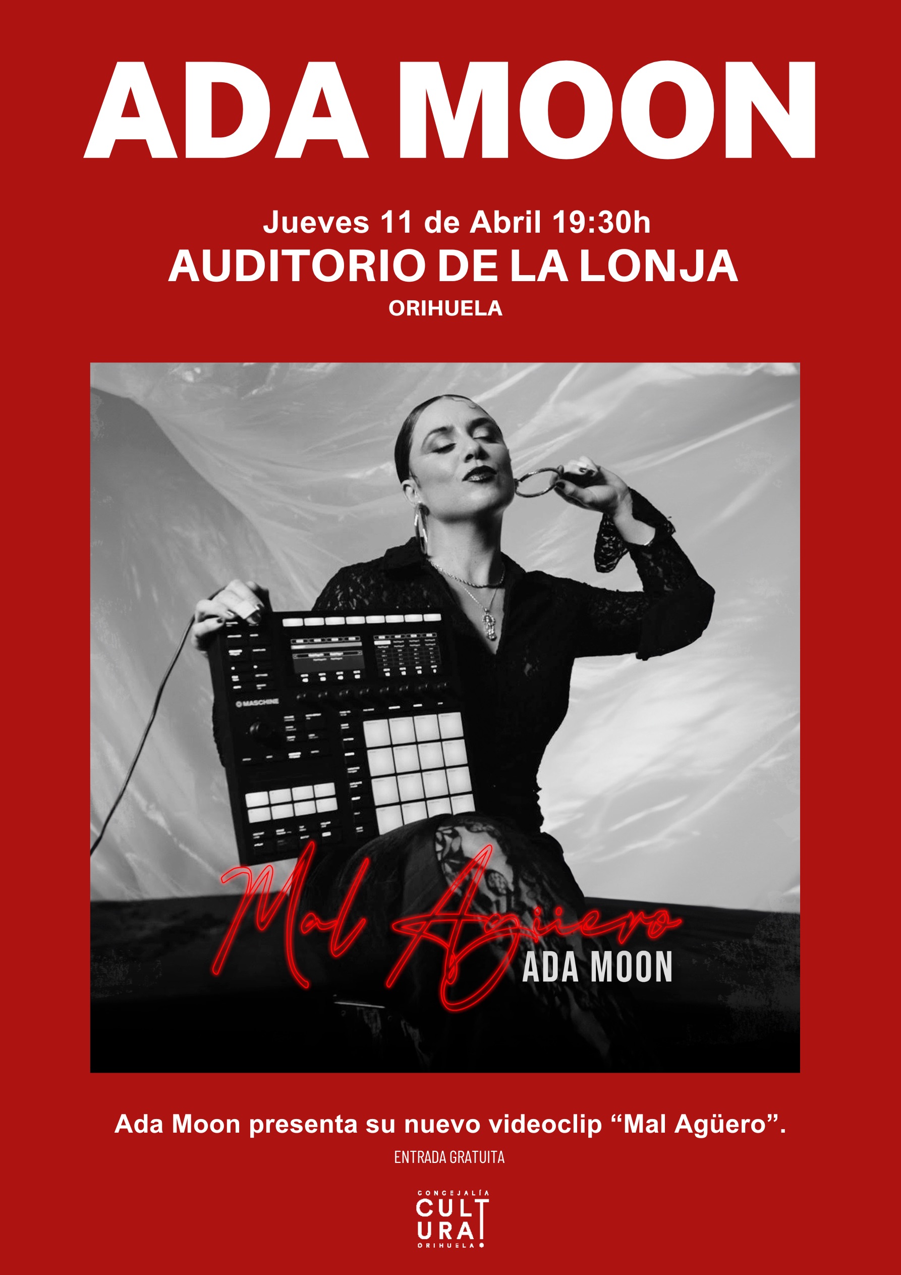El próximo jueves 11 de abril a las 19:30h en Orihuela, en el Auditorio de la Lonja, tendrá lugar la presentación del videoclip del nuevo single de Ada Moon, «Mal agüero».