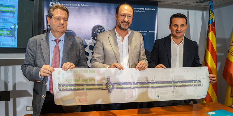 El alcalde de Orihuela, Emilio Bascuñana, y el diputado provincial de Planes de Mejora a Municipios, Bernabé Cano, presentaron este martes el proyecto de «Pavimentación paseo de Los Andenes-Avda. Teodomiro», junto al concejal de Infraestructuras y diputado provincial, Francisco Sáez.