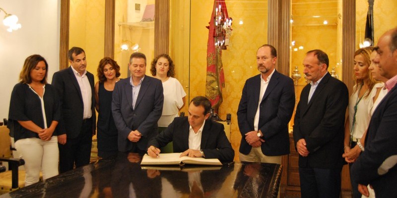 Miembros de la Corporación Municipal, presidida por el alcalde, Emilio Bascuñana, recibieron, previamente a la visita de las instalaciones hídricas, al presidente de la Diputación de Alicante en la Sala del Oriol, donde César Sánchez firmó en el Libro de Honor de la ciudad, con motivo de su primera visita oficial al Ayuntamiento de Orihuela.