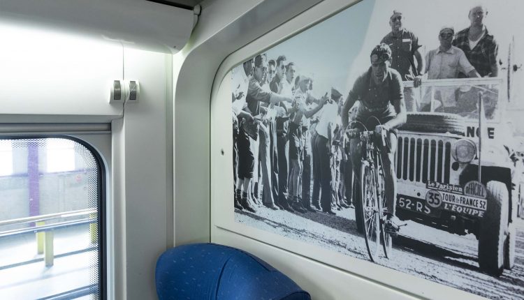 Desde hoy, Renfe expone una selección de fotografías del mundo del ciclismo en el interior de un tren Alvia Madrid-Bilbao con motivo del 120 aniversario del nacimiento del Tour de Francia y que este año se inicia en Bilbao. La muestra, que lleva por título “Campeones eternos, sueños cumplidos” es un tributo a los 7 ciclistas españoles ganadores de la competición francesa y a los 11 ciclistas que han subido al podio desde el inicio de la prueba.