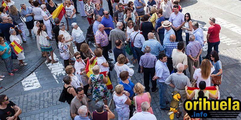 Casi un centenar de personas se han concentrado hoy en la puerta del ayuntamiento de Orihuela para expresar su rechazo contra el referendum que se pretende celebrar mañana día de octubre en Cataluña para conseguir la independencia de dicha autonomía. A la protesta se han sumado también el alcalde, Emilio Bascuñana, y otros miembros de la corporación municipal.