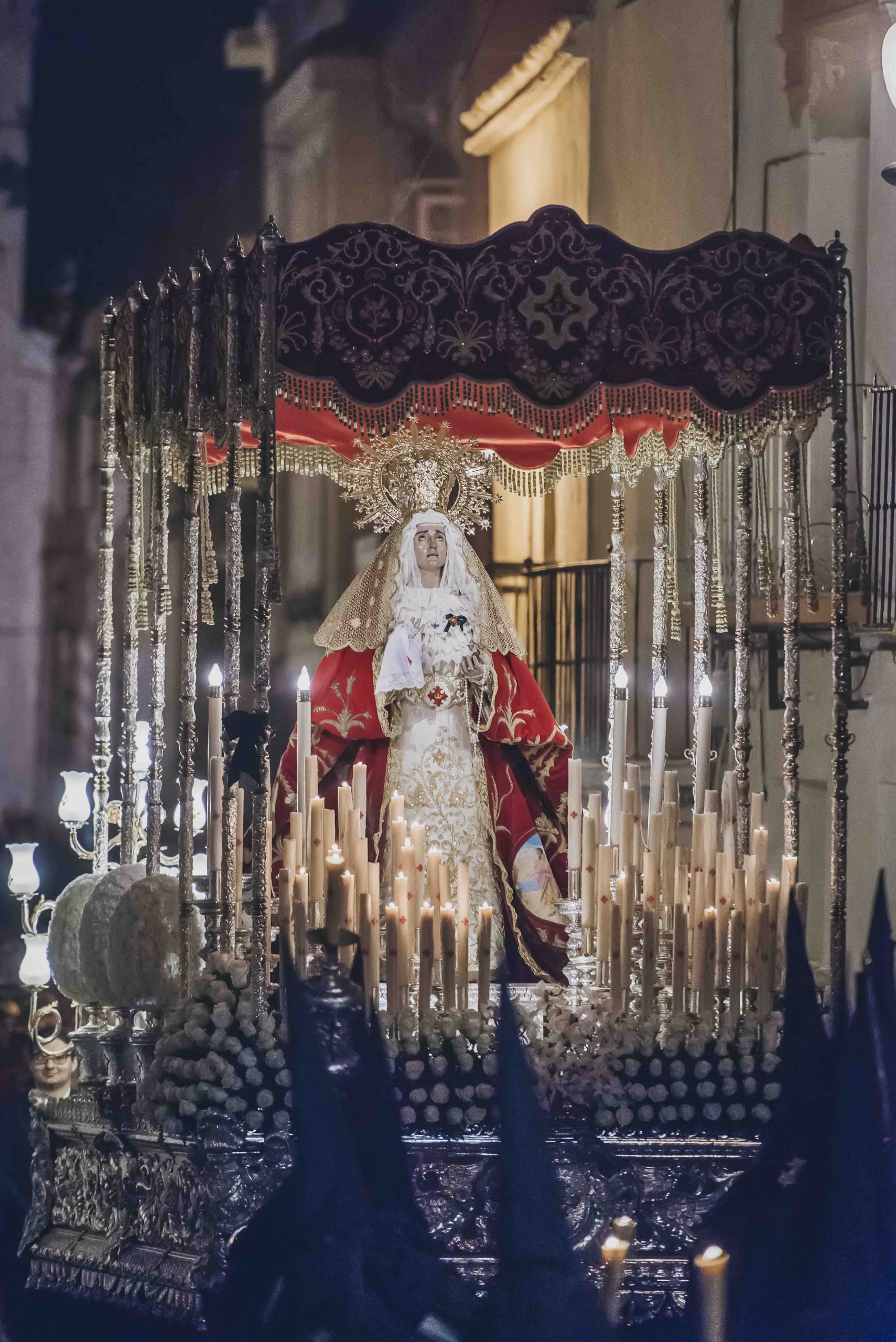 Dos ciriales acompañan a María en la soledad de su dolor, llorando junto a ella lágrimas de cera por nuestros pecados, pero dándonos a su vez la luz de nuestra redención.