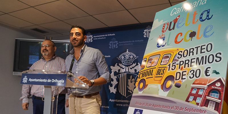 Así, a partir de mañana y hasta el 30 de septiembre «los comercios repartirán entre los clientes papeletas para participar en un sorteo de quince premios por valor de 30 euros para gastar en el comercio oriolano» aseguró el vicepresidente de ACMO, Trino Belmar, ya que en esta iniciativa se han unido la Asociación de Comerciantes de Orihuela y Calles Con Alma, de manera que la campaña abarca al casco oriolano, de manera que según avanzó el concejal de Comercio «se prevé la participación en esta iniciativa de cerca de doscientos establecimientos». Tanto Aparicio como Belmar animaron «a los oriolanos a comprar en el comercio de Orihuela y preparen su vuelta al cole con las ofertas y productos que ofrecen los establecimientos de la ciudad».