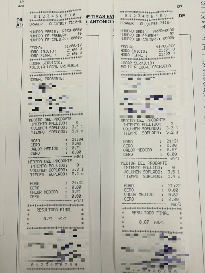 Tras hacerle la prueba de alcoholemia arrojó un resultado de 0.71mg/l en una primera prueba y 0.67mg/l en la segunda por lo que los agentes procedieron a su detención.