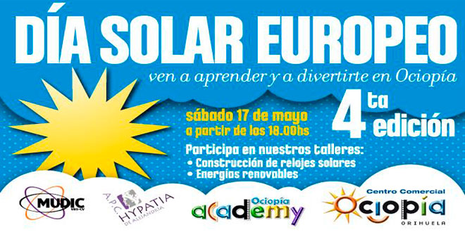 Por cuarto año consecutivo, el Centro Comercial Ociopía será sede para Conmemorar el Día Solar Europeo, a través de una actividad organizada por la Asociación de Profesores de Ciencias «Hypatia de Alejandría» y el Museo Didáctico Interactivo de la Vega Baja del Segura de la Comunitat Valenciana (MUDIC).