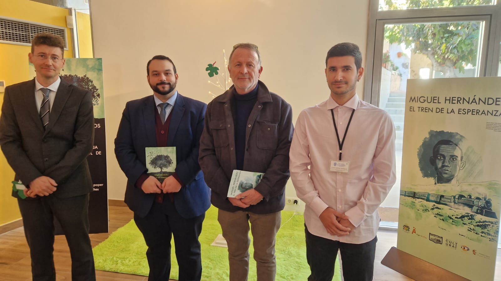Este jueves se ha inaugurado la exposición “Miguel Hernández. El tren de la esperanza” en la Sala de Exposiciones Miguel Hernández (en el Rincón Hernandiano). Esta muestra artística ha sido diseñada, organizada y producida por la Concejalía de Cultura del Ayuntamiento, y ha contado con la colaboración de la editorial Amigos de Papel, la Asociación Alicantina Amigos del Ferrocarril y la Fundación Cultural Miguel Hernández. Al acto de presentación han acudido Gonzalo Montoya (edil de Cultura), Pedro Villar (uno de los autores del libro en el que se ha basado la exposición), Tomás Serna (director de la Casa Museo Miguel Hernández y comisario de la exposición) y Vicente Iglesias (comisario de la exposición).