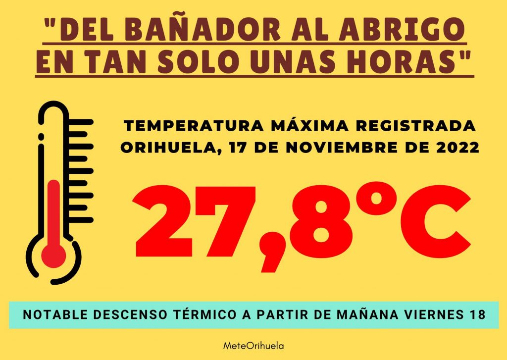 Hoy, jueves, 17 de noviembre de 2022, en Orihuela la temperatura máxima ha sido de 27,8ºC.