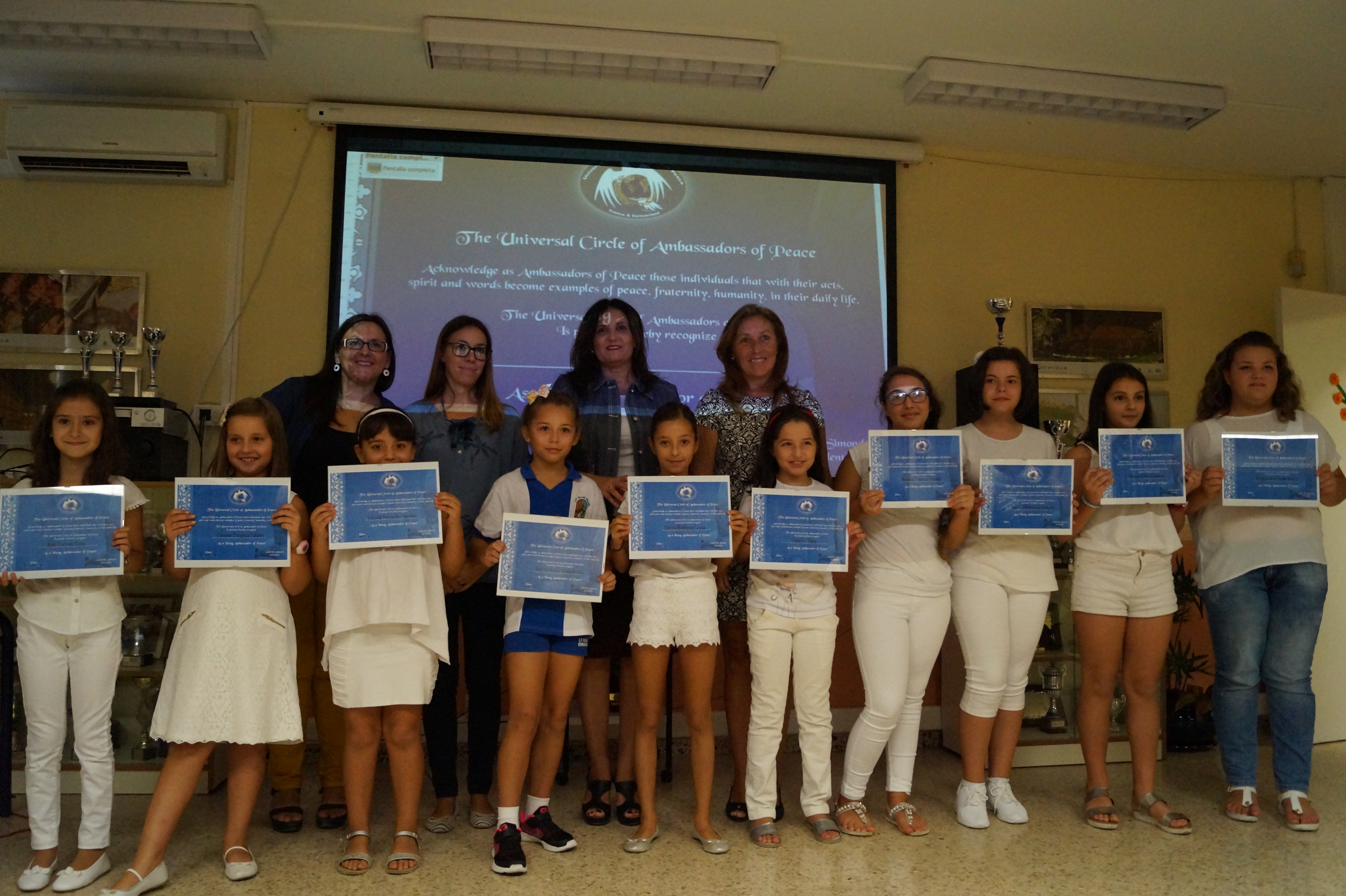 Y es que este año diez alumnas del centro oriolano han sido reconocidas como Embajadoras de la Paz (Mª José Barberá, Paulina Ilinova, Telma Gil, Yolanda Fernández, Ramona Contreras, Ana Correas, Carmen Zaragoza, Gergana Vesleinova, Margarita Aráez y Daniela Rodríguez), como reconocimiento a la labor del colegio que diariamente trabajan con los alumnos “fomentando acciones a través de un dado de la paz con frases que emplean para resolver sus conflictos”, explicó la coordinadora del programa Cristina Gonzálvez, mientras que la directora del colegio Villar Palasí, Miriam Araujo insistió en la importancia de “trabajar el concepto de la paz desde edades tempranas es necesario porque terminará siendo parte de ellos”.