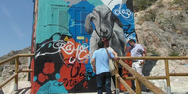 La concejala de Cultura y Turismo, Rosa Martínez, y el concejal de Fomento de Empleo, Manuel Gallud, han presentado hoy el grafiti realizado por el artista oriolano Javier Agulló. Gallud ha señalado que esta obra es “la culminación del Plan de Empleo que se ha desarrollado durante seis meses y que ha supuesto la contratación de 26 personas que han desarrollado trabajo de mejora y recuperación de todo el cinturón de la sierra”. Las obras consistieron en la construcción de un paseo turístico en la parte trasera de la calle Arriba que “ha puesto en valor el Rincón Hernandiano”.