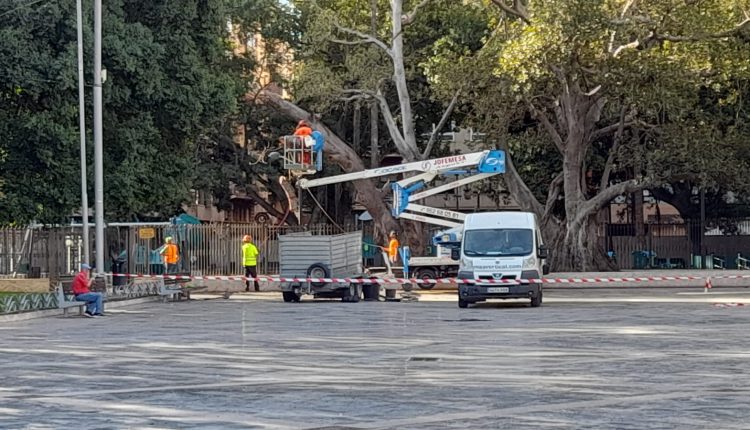 El Ayuntamiento de Orihuela realiza labores de conservación en el ficus monumental de la Glorieta Gabriel Miró