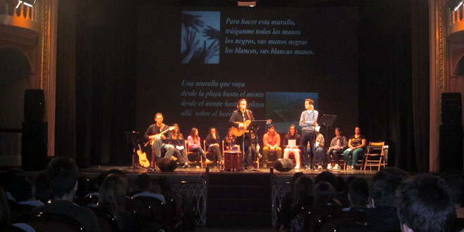 El cantautor andaluz Paco Damas ha ofrecido esta mañana un concierto a unos 500 alumnos de diversos centros escolares de Orihuela, en el que ha interpretado poemas musicados dedicados a mujeres, como Alfonsina y el mar, Yolanda o Desde mi libertad. Intercalados con las canciones una decena de alumnos han leído poemas de homenaje a Clara Campoamor, Rosalía de Castro, Zenobia Camprubí, María T. León o María Zambrano.