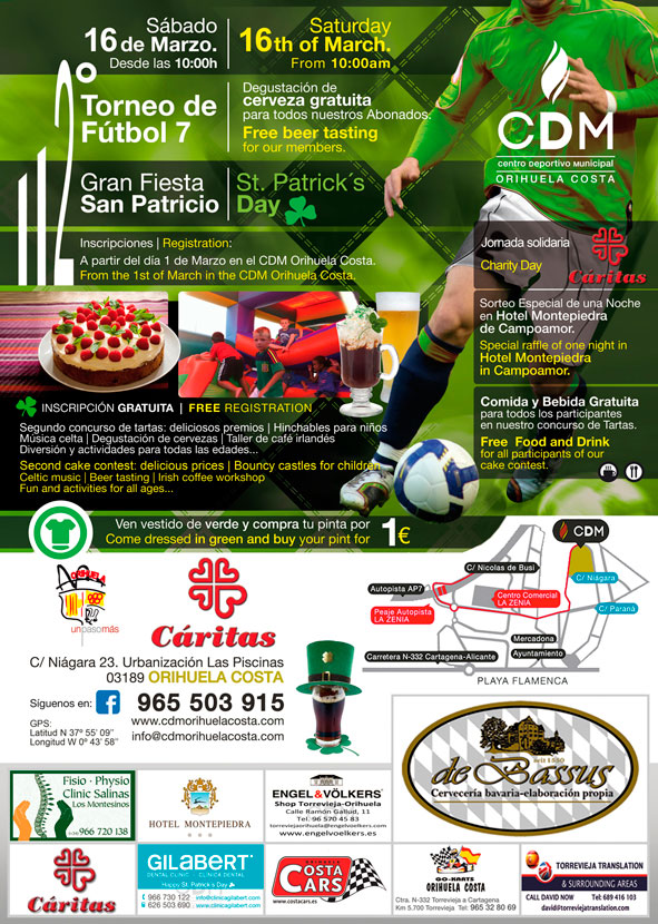 Se realizarán una serie de actividades, entre las que destaca, el II Torneo de Fútbol 7 St. Pactrick’s Day, en el que participarán niños y adultos. La inscripción al torneo es totalmente gratuita, simplemente hay que realizar una aportación de alimentos, productos de higiene, etc. que se entregaran a Cáritas Orihuela Costa para que lo distribuya entre los más necesitados.