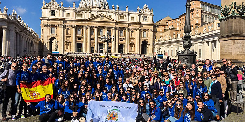Ayer miércoles 30 de marzo, los alumnos de 1º de BAT del Colegio Diocesano Santo Domingo, como se lleva haciendo más de 30 años, junto a un grupo de padres y profesores del Colegio, asistieron a la Audiencia Papal en la Plaza San Pedro. En total fueron cerca de 150 miembros de la Comunidad Educativa los que participaron en la Peregrinación Jubilar a Roma para vivir el Año de la Misericordia. Como en los años anteriores, el Papa les saludó al nombrarles como Colegio de la Diócesis de Orihuela-Alicante presente en la Audiencia.
