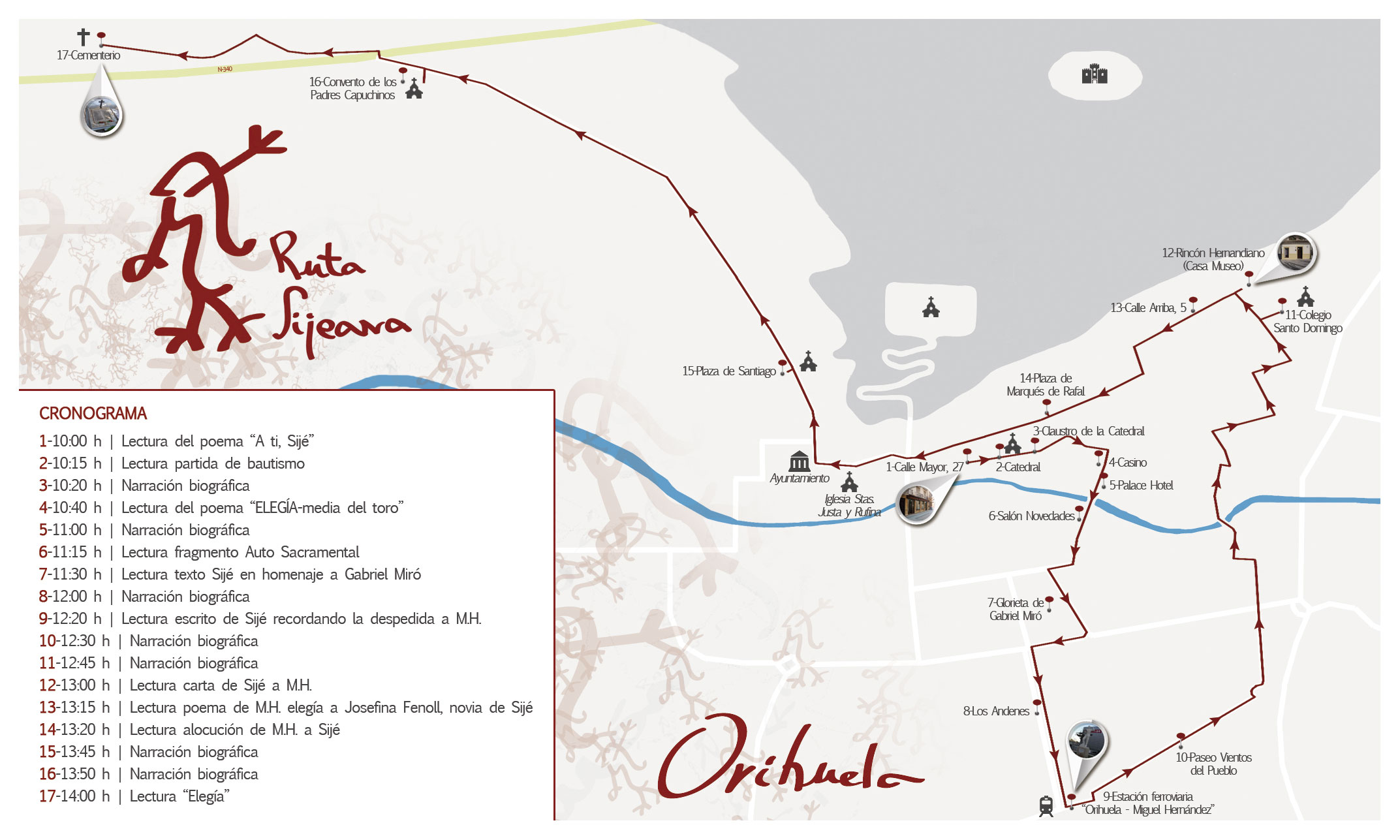Esteve ha remarcado que se trata de homenajear a Ramón Sijé y a Miguel Hernández en una fecha, el 14 de abril, en que la Plaza de la Pía pasó a llamarse Plaza de Ramón Sijé, donde Miguel Hernández dedicó el 14 de marzo de 1936 una alocución a su amigo subido a una escalera, que será recreada para la ocasión. Y también ha recordado que en la parada de la ruta en la Glorieta Gabriel Miró se recreará y repetirá la alocución de Sijé el 2 de octubre de 1932, fecha en la que se inauguró el busto de Miró.