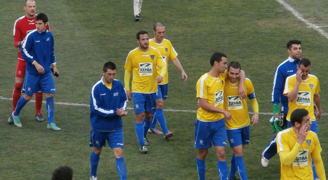 La primera parte comenzó con un claro dominio local, ya en el minuto 4 Óscar Sierra lo intentaba pero el balón salía por encima del travesaño. Conforme iba avanzado el tiempo el Orihuela se iba metiendo en el partido, consiguiendo hacerse con el mando, el esférico estaba cada vez más cerca de la portería de Toni, pero sin ningún tiro claro por parte de los amarillos. En el 14 Arkaitz se metía dentro del área, intentando el chut para los de Nino, pero el meta catalán atajaba sin problemas.