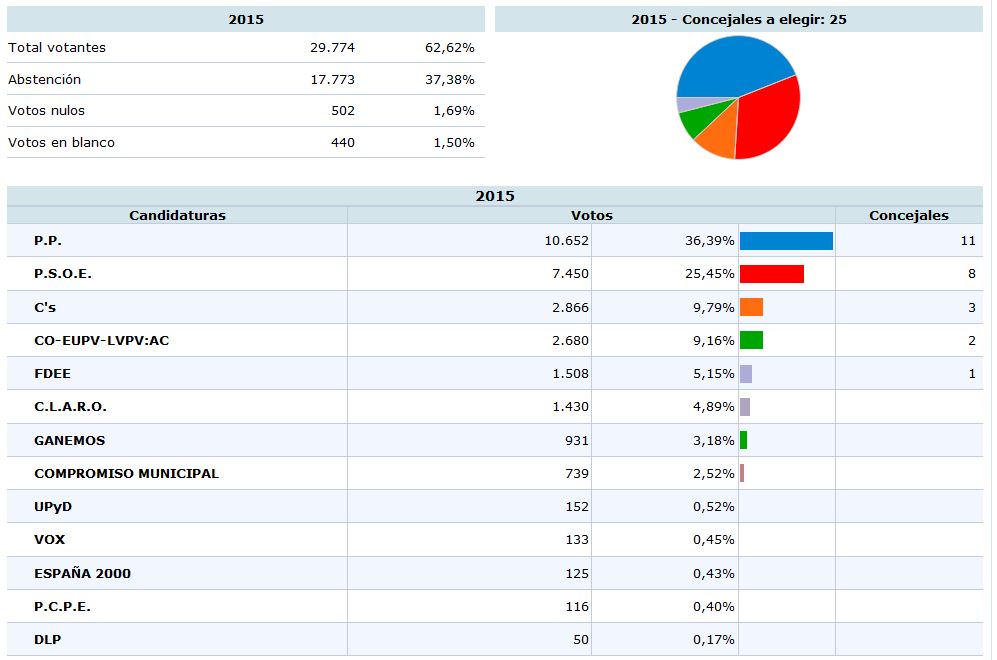 Acaba de terminar el escrutinio oficial de las elecciones municipales 2015, las cuales le han dado la victoria al Partido Popular con 10.652 votos y 11 concejales, frente a los 7.450 votos y 8 concejales del PSOE.