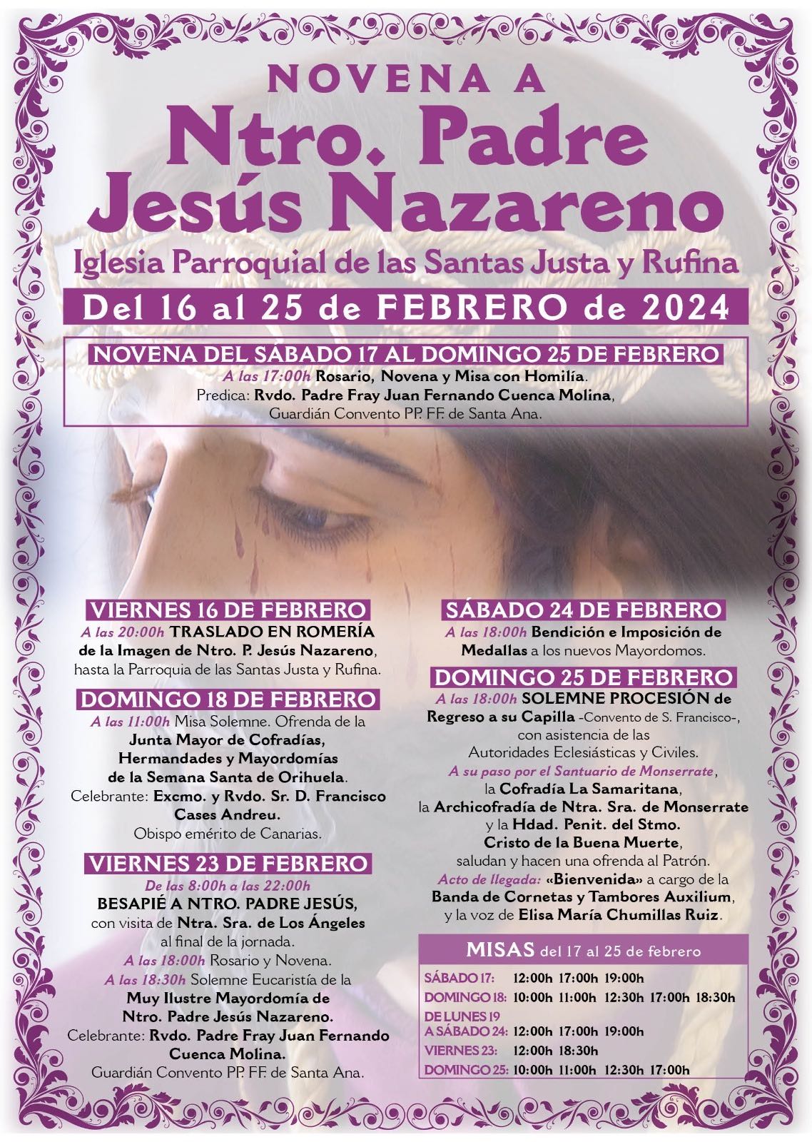 – Solemne Eucaristía ofrecida por la Junta Mayor de Cofradías, Hermandades y Mayordomías de la Semana Santa de Orihuela en honor a Ntro. Padre Jesús Nazareno, oficiada por el consiliario de la Junta Mayor el Rvdo. Padre D. José A. Moya Grau Moya, domingo 18 de febrero, a las 11:00 h.