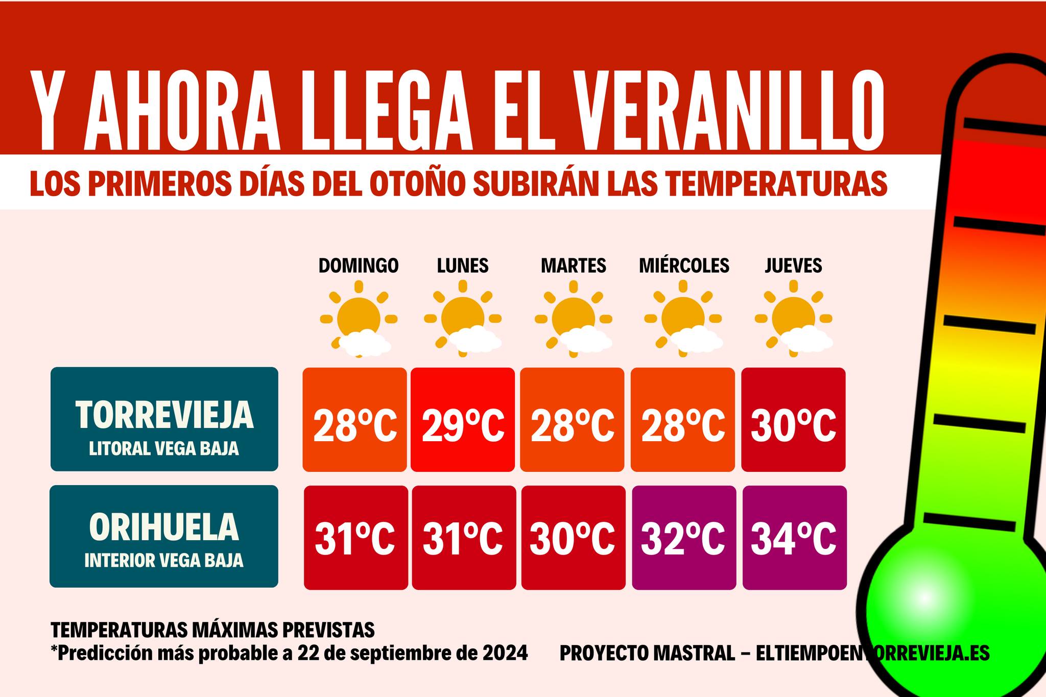 Proyecto Mastral, información meteorológica y climatológica de Torrevieja y Vega Baja del Segura, ha anunciado que los primeros días del otoño astronómico, que comenzará este domingo a las 14:44 horas, traerán consigo un retorno inesperado de temperaturas veraniegas. A pesar de las lluvias y el tiempo variable de la semana anterior, los próximos días estarán dominados por cielos despejados y sol, sin precipitaciones a la vista.