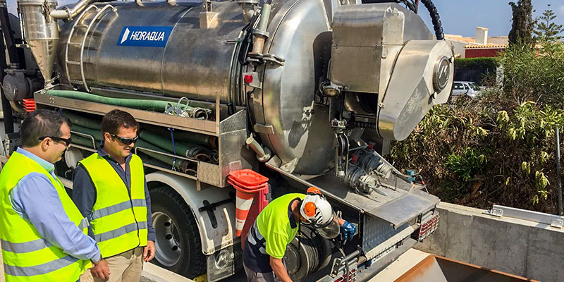 El concejal de Medio Ambiente y responsable del área de Ciclo Integral del Agua, Miguel Ángel Fernández, y el gerente de Hidraqua, Juan José Alonso, supervisaron esta semana el funcionamiento de la nueva instalación con la que se han realizado trabajos de descarga de residuos no peligrosos en la red de alcantarillado de Orihuela Costa, y en los que se han empleado camiones impulsores succionadores encargados de la limpieza de esta red.
