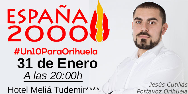 El próximo sábado 31 de enero, a las 20:00h, el partido España 2000 celebrará un acto público en el Hotel Meliá Tudemir para presentar sus 10 propuestas para mejorar Orihuela, al cual están invitados todos los oriolanos.