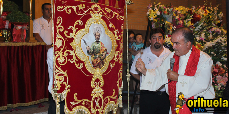Ayer tuvo lugar la tradicional ofrenda de flores que hacen todos los años los vecinos de San Bartolomé al Patrón de la pedanía. También fue un día especial ya que una familia, la cual ha querido permanecer en el anonimato, ha donado a los costaleros un estandarte que incluye un lienzo con una reproducción de San Bartolomé pintada por Victor García Villalgordo, pintor y escultor torrevejense. Será estrenado en la procesión de hoy tal como dijo el párroco.