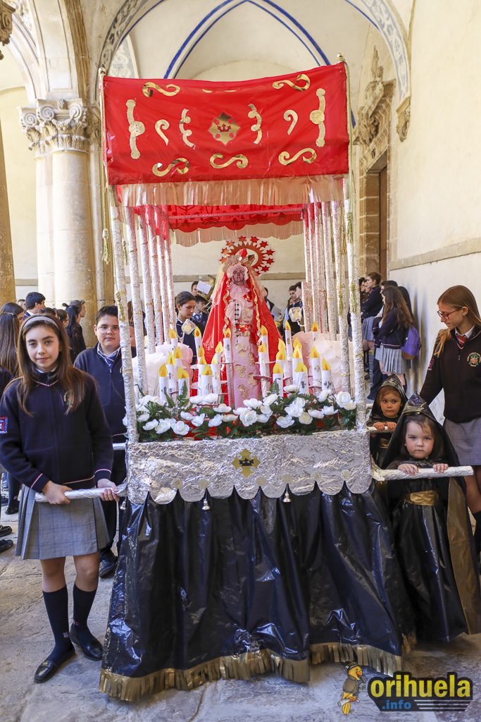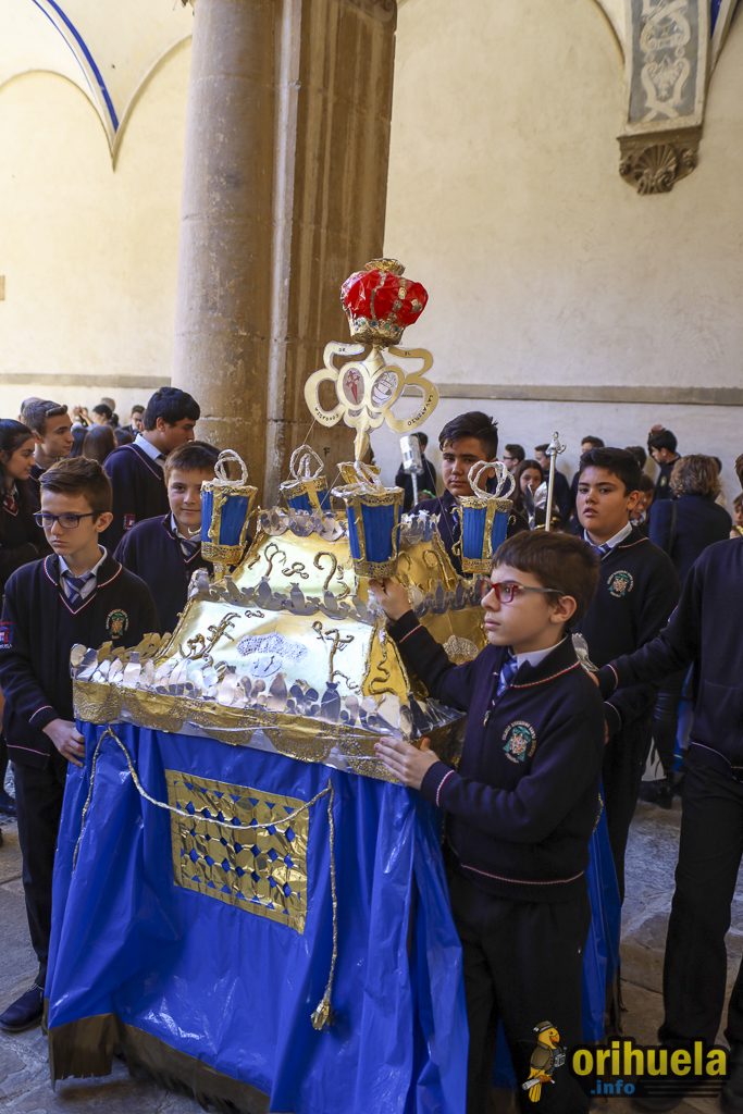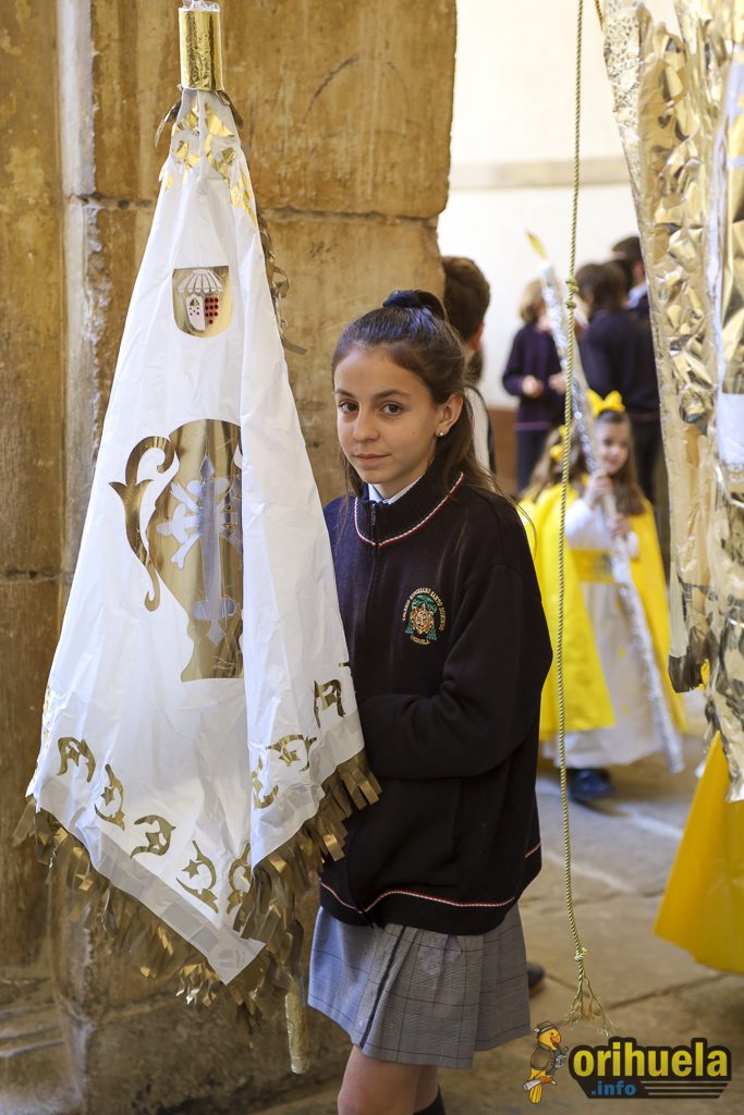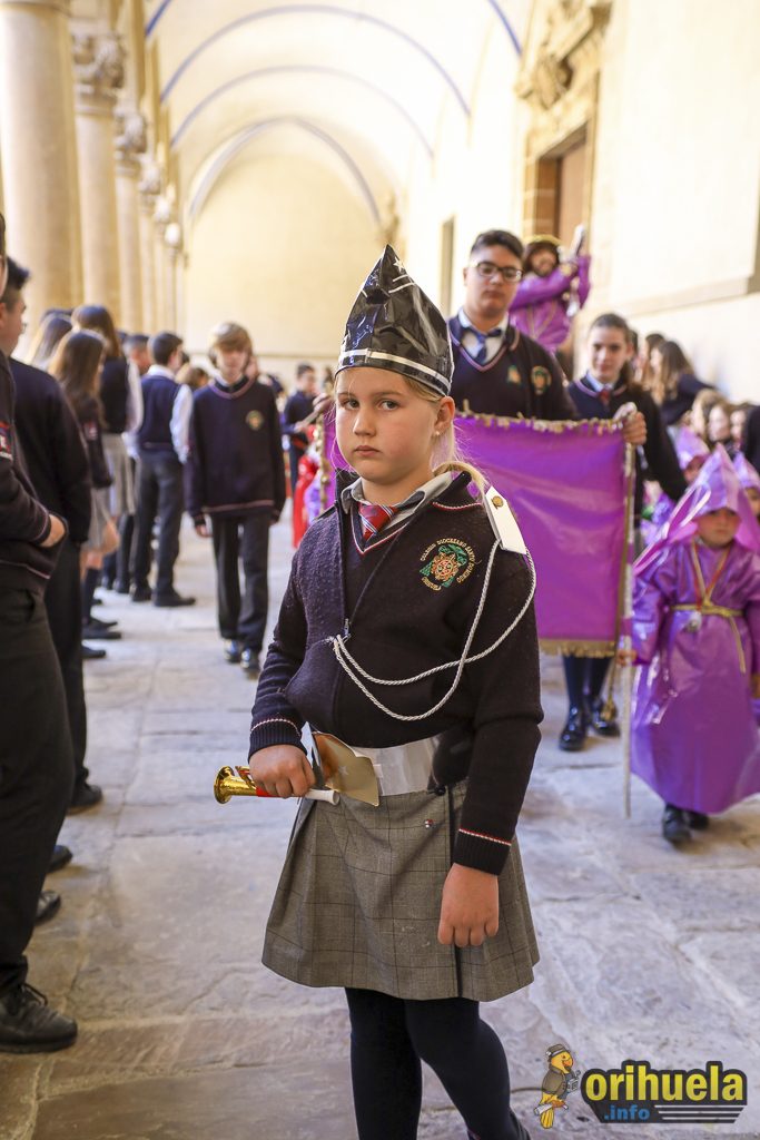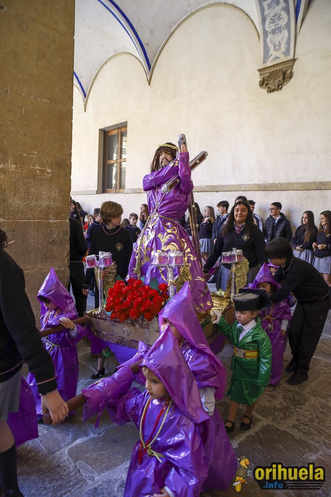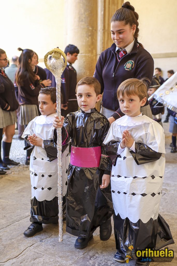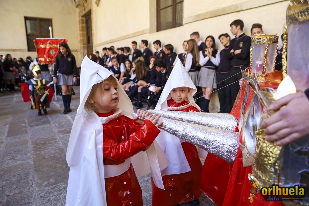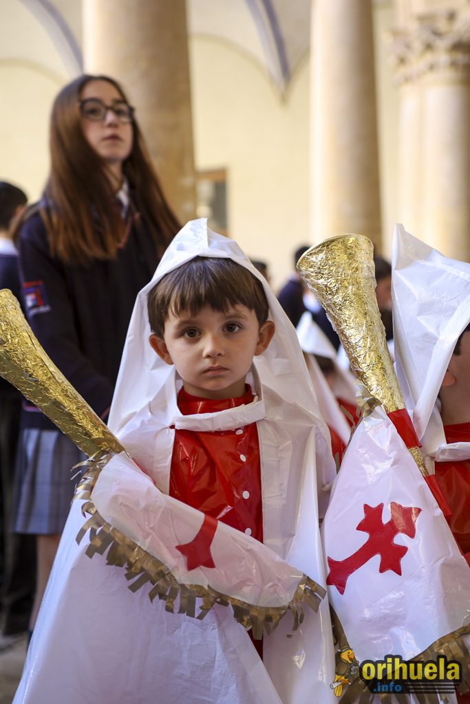 La segunda de las procesiones infantiles de hoy ha sido la del Colegio Santo Domingo, en la que como todos los años han participado cientos de alumnos de todas las edades. Esta procesión transcurre por el claustro y patio de la universidad del colegio y luego sale a la calle por la puerta de la universidad para volver a entrar por la puerta principal.