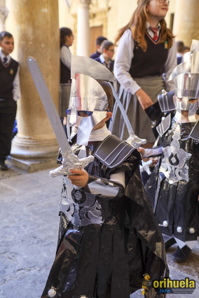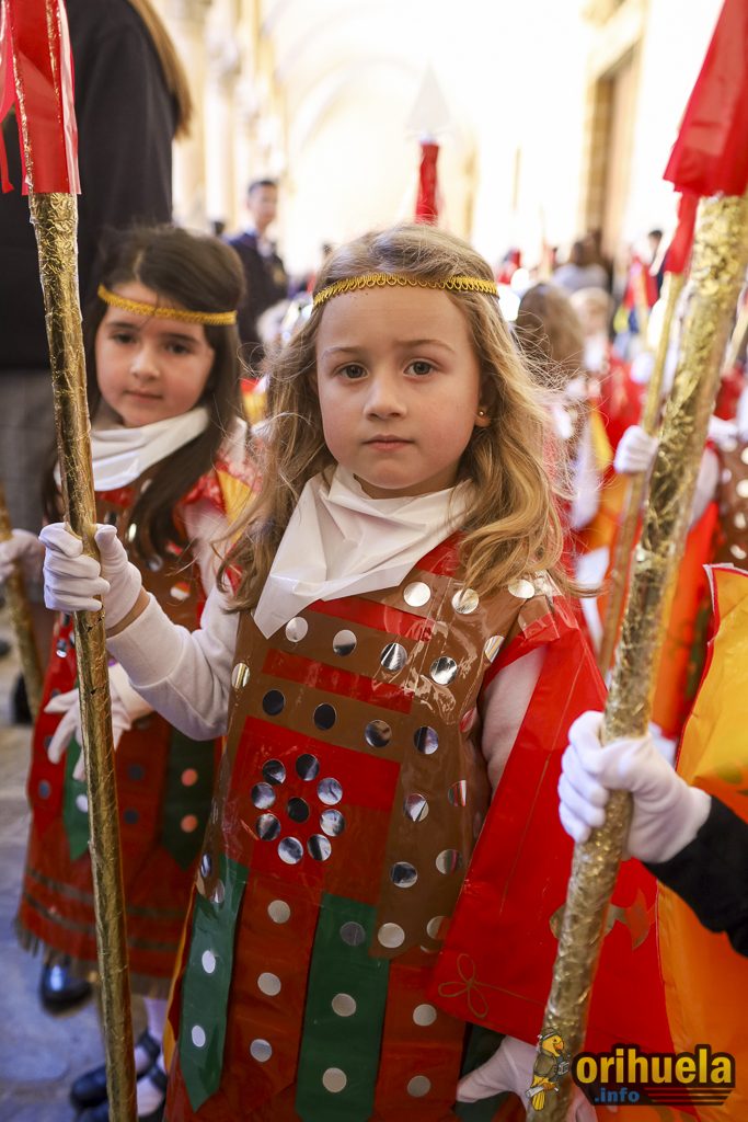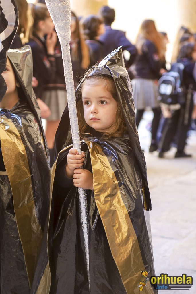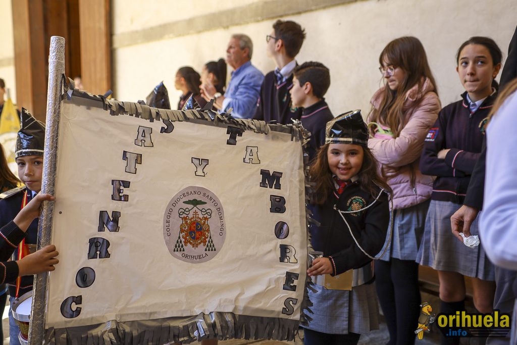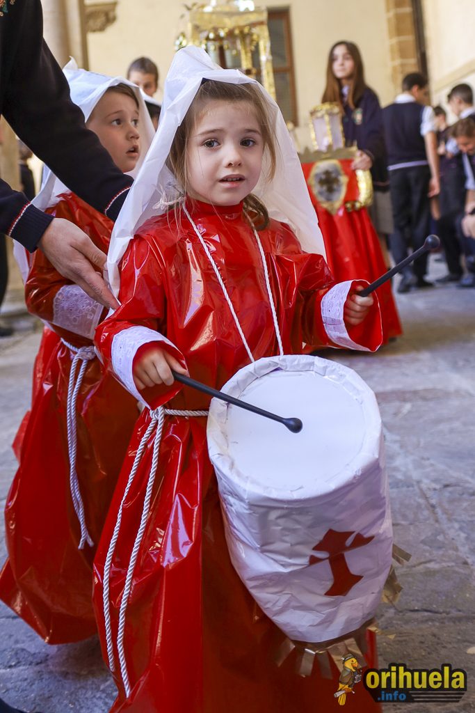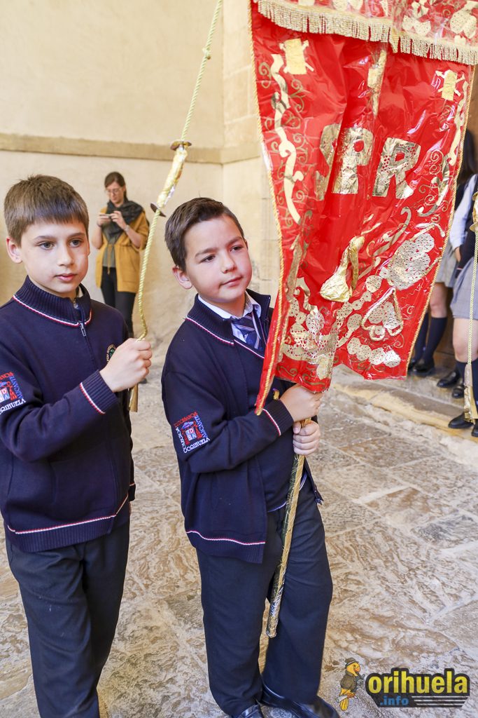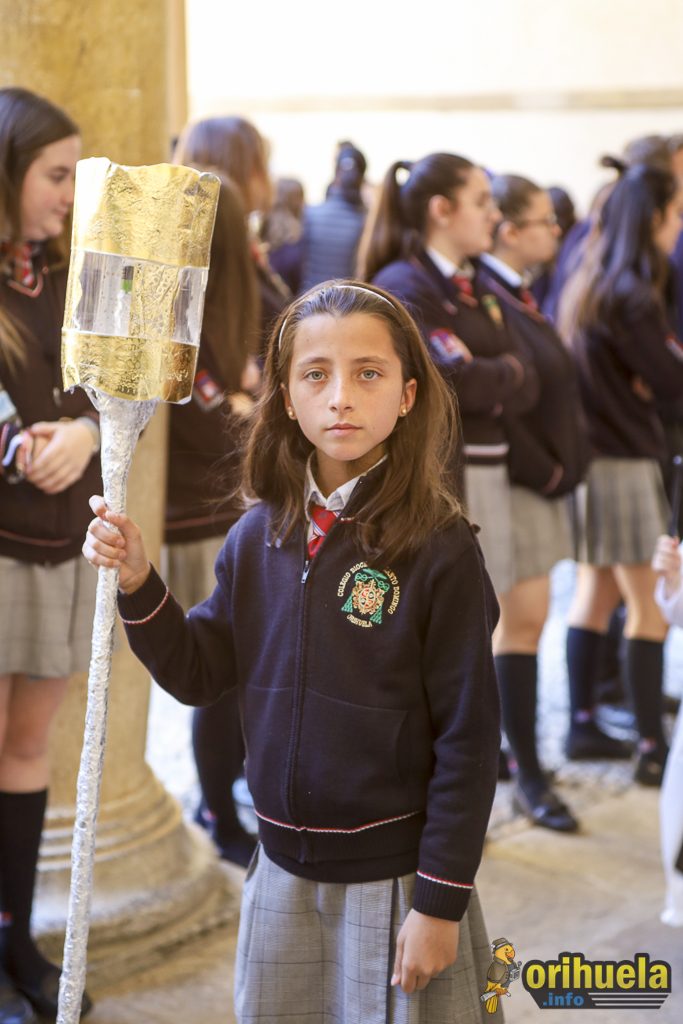 La segunda de las procesiones infantiles de hoy ha sido la del Colegio Santo Domingo, en la que como todos los años han participado cientos de alumnos de todas las edades. Esta procesión transcurre por el claustro y patio de la universidad del colegio y luego sale a la calle por la puerta de la universidad para volver a entrar por la puerta principal.