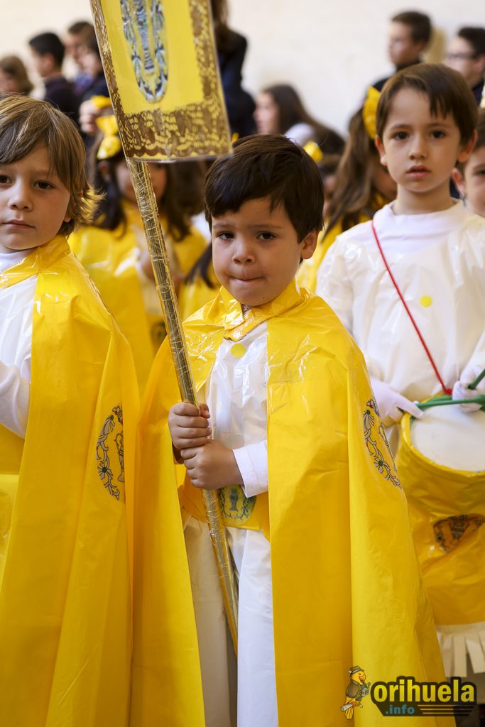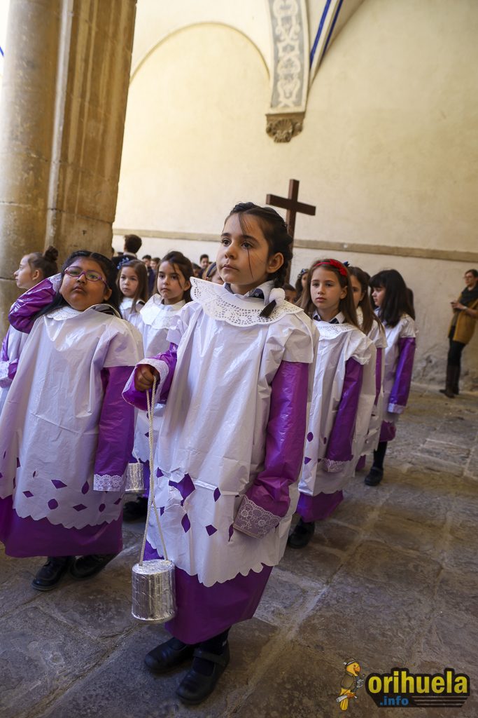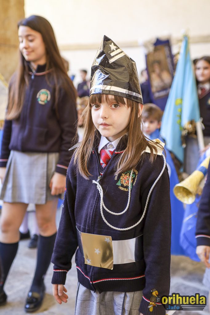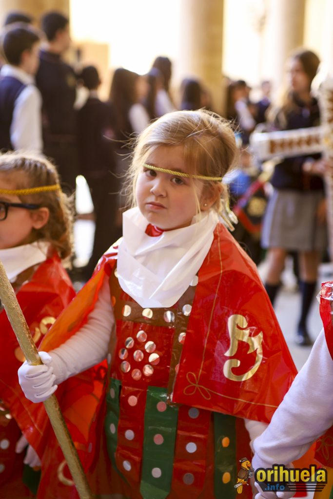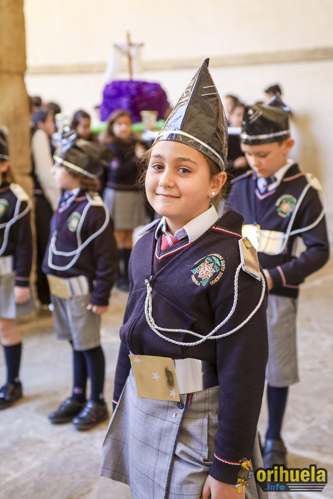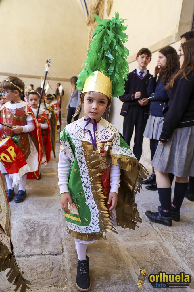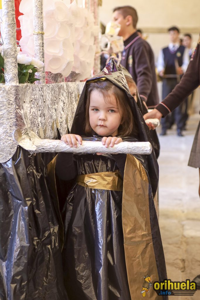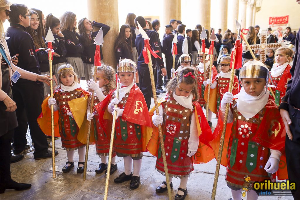 La segunda de las procesiones infantiles de hoy ha sido la del Colegio Santo Domingo, en la que como todos los años han participado cientos de alumnos de todas las edades. Esta procesión transcurre por el claustro y patio de la universidad del colegio y luego sale a la calle por la puerta de la universidad para volver a entrar por la puerta principal.