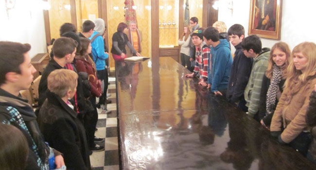 El alcalde de Orihuela, Monserrate Guillén, y la Concejala de Educación, Rosa Martínez, han recibido en el Ayuntamiento a un centenar de alumnos de 4º de la ESO de los institutos Playa Flamenca y Tháder que han estado visitando la ciudad en una jornada de convivencia entre ellos impulsada por las AMPAS y los equipos directivos de ambos centros con el apoyo económico al proyecto de la Concejalía del área. Los alumnos han visitado el salón de plenos y la Sala del Oriol, donde el regidor les ha dirigido unas palabras de bienvenida y les ha orientado en una pequeña ruta por el Consistorio, que ha incluido el mismo despacho de alcaldía.