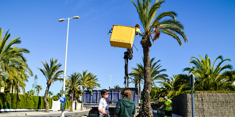 El importe de este contrato ha ascendido a 21.175 euros (IVA incluido) y los trabajos han comenzado esta semana en la Avenida del Cabo Roig eliminando el ramaje y dátiles de las palmeras de los viales de la misma.