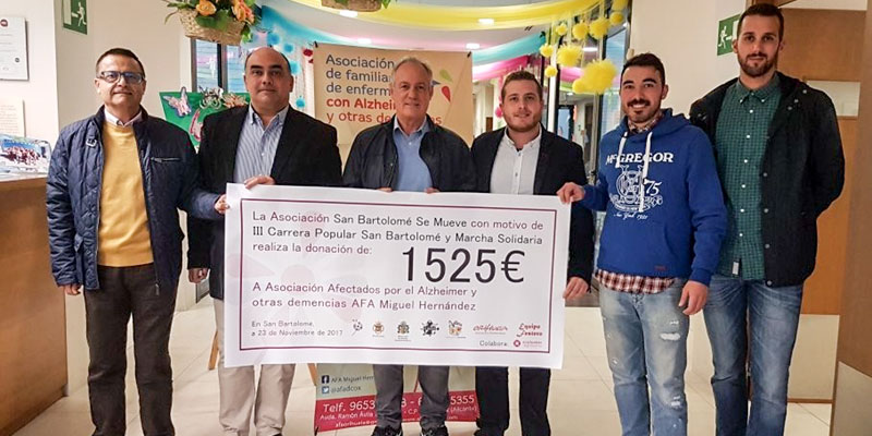 La asociación «San Bartolomé se mueve», presidida por Jose Luis Devés, junto con el concejal de Deportes del Ayuntamiento de Orihuela, Víctor Valverde, y el alcalde de la pedanía, Manuel Ortuño, ha hecho entrega de un cheque por valor de 1.525 euros a la asociación AFA de Familiares de Enfermos con Alzheimer y otras demencias Miguel Hernández.