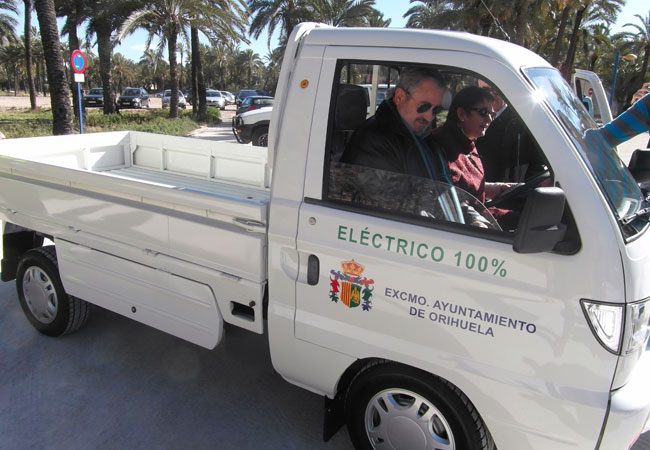 El alcalde de Orihuela, Monserrate Guillén, y la concejala de Medio Ambiente y Patrimonio Natural, Anunciación Belchí, han presentado hoy el nuevo camión eléctrico adquirido por el Ayuntamiento. Este vehículo, cuyo coste ha sido de 16.000 euros, se utilizará en las labores de mantenimiento. Belchí ha detallado que el camión servirá para “el transporte de las podas de las palmeras o de árboles de dimensiones pequeñas”. La edil ha deseado que la adquisición de este vehículo “se extienda a la ciudadanía y se usen más coches no contaminantes”. El camión tiene una autonomía de 70 kilómetros y alcanza una velocidad de 60 kilómetros por hora.