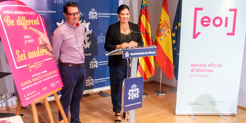 La concejal de Educación, Begoña Cuartero, junto a Sergio García, el director de la Escuela Oficial de Idiomas, ha anunciado esta mañana la apertura del curso de la EOI de Orihuela, el primero tras la aprobación del Decreto de Conselleria que reconoce su creación de manera definitiva.