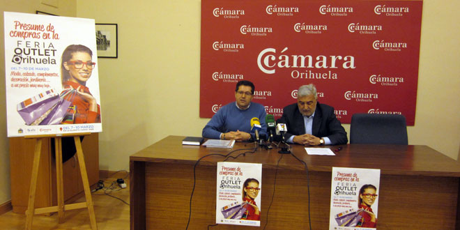 El presidente de la Cámara de Comercio de Orihuela, Félix Cerdán, y el Concejal de Comercio, Manuel Gallud, han presentado en la sede cameral la celebración de la Feria Outlet que se celebrará del 7 al 10 de marzo en la Glorieta Gabriel Miró, como fruto del convenio firmado entre ambas instituciones para la promoción del comercio.
