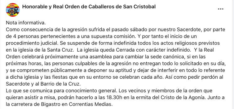 Como consecuencia de la agresión sufrida el pasado sábado por nuestro Sacerdote, por parte de 4 personas pertenecientes a una supuesta comisión. Y por tanto el inicio de un procedimiento judicial. Se suspende de forma indefinida todos los actos religiosos previstos en la iglesia de la Santa Cruz. La iglesia queda Cerrada con carácter indefinido. Y la Real Orden celebrará próximamente una asamblea para cambiar la sede canónica, si en las próximas horas, las personas culpables de la agresión no entregan todo lo solicitado en su día, y se comprometen públicamente a deponer su aptitud y dejar de interferir en todo lo referente a dicha iglesia y las fiestas que en su entorno se celebran cada año. Así como pedir perdón al Sacerdote y al Barrio de la Cruz.