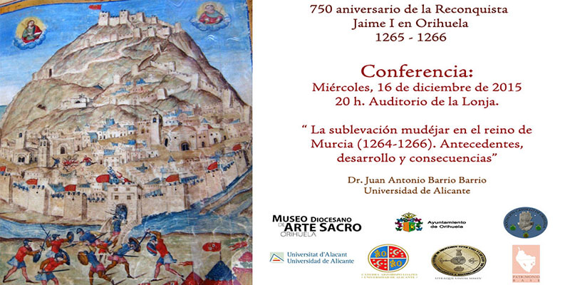Las asociaciones Patrimonio Base, Koiné Vega, Castillo de Orihuela y Santa Justa y Rufina, junto a la Universidad de Alicante, el Museo Diocesano de Arte Sacro y el Excelentísimo Ayuntamiento de Orihuela, han organizado para hoy miércoles 16 de diciembre a las 20.00 horas, la conferencia titulada “La sublevación mudéjar en el reino de Murcia (1264-1266). Antecedentes, desarrollo y consecuencias”, a cargo del prestigioso doctor de Historia Medieval de la Universidad de Alicante, don Juan Antonio Barrio Barrio.