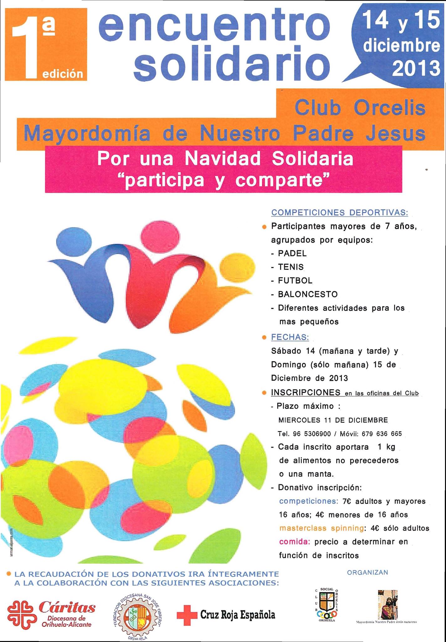 La Mayordomía de Nuestro Padre Jesus y el Club Orcelis han previsto organizar una campaña benéfica bajo el lema «Por una Navidad Solidaria – Participa y Comparte» entre cuyas actividades se celebrará, en las instalaciones del Club, la 1ª edición de un «Encuentro Solidario», de naturaleza deportiva y social, que consistirá en 2 jornadas de convivencia (sábado 14 y domingo 15 de diciembre) donde se desarrollarán tanto actividades deportivas como un torneo que abarcará distintas modalidades (pádel, tenis, futbol, baloncesto…) y donde tú formarás parte activa de uno de los equipos que se organizará para su desarrollo. También habrá una masterclass de spinning y actividades sociales destinadas a los más pequeños.
