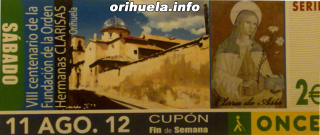 El próximo viernes 11 de agosto, el cupón de los viernes de la Once estará dedicado al VIII Centenario de la Fundación de la Orden de las Clarisas de Orihuela. El motivo de elegir el 11 de agosto es porque ese día es el de Santa Clara, la que fuera fundadora de las Clarisas.