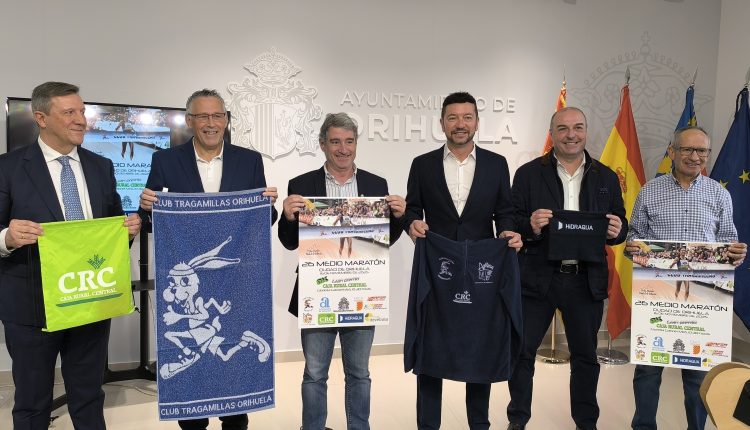 El alcalde de Orihuela, Pepe Vegara, y el concejal de Deportes, Víctor Sigüenza, han presentado, junto a Paco Belmonte, presidente del Club Tragamillas; José Caselles, director técnico; Antonio Pastor, jefe de zona de CRC; y Andrés Martínez, gerente de Hidraqua, la XXVI edición de la Media Maratón “Ciudad de Orihuela”, que se celebrará el próximo domingo 16 de noviembre.
