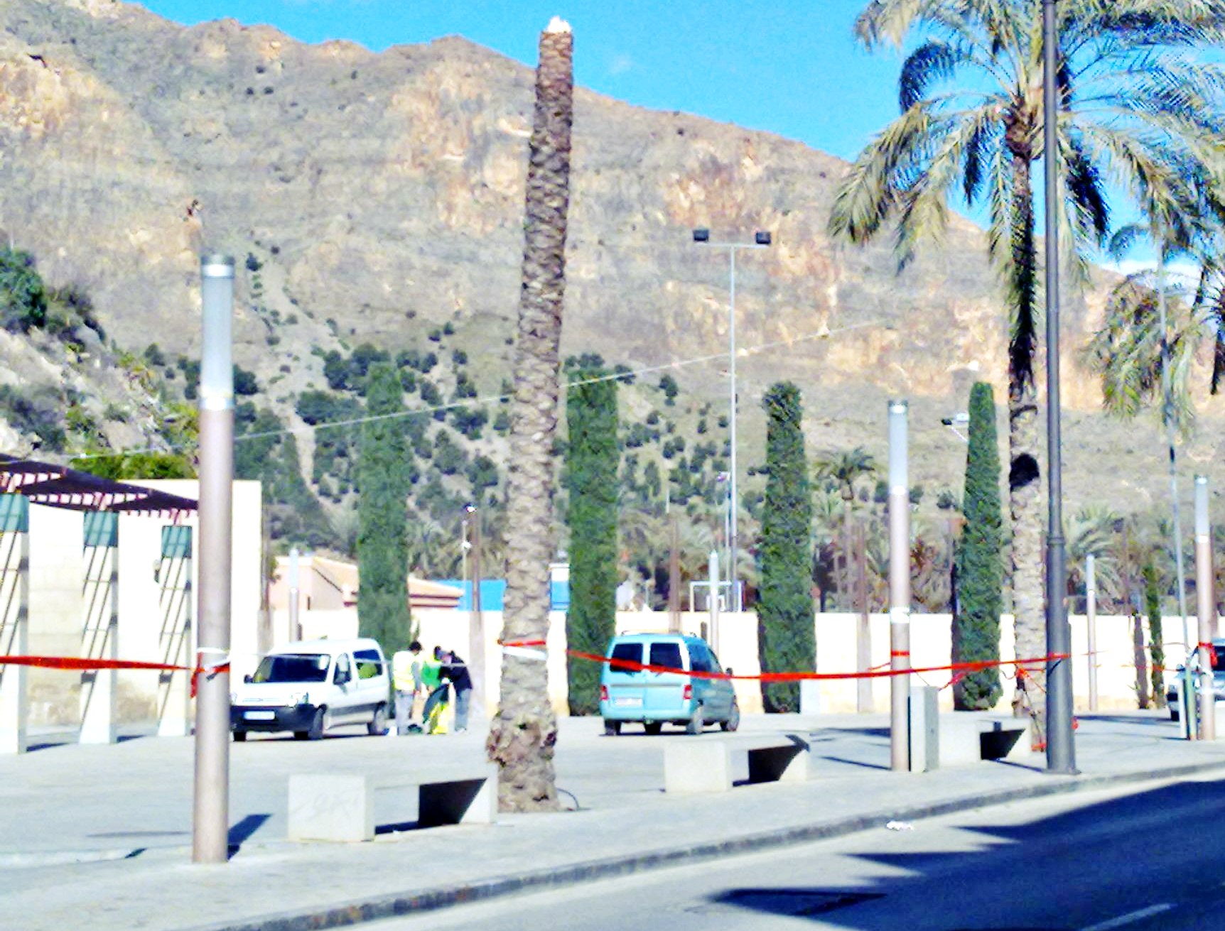 Uno de los casos se produjo en la zona del Colegio Santo Domingo, la policía tuvo que acordonarla para que los trabajadores del Ayuntamiento pudieran retirar las dos palmeras que se habían caído, por fortuna sin lamentar daños personales. También se desplomaron varias en el palmeral.