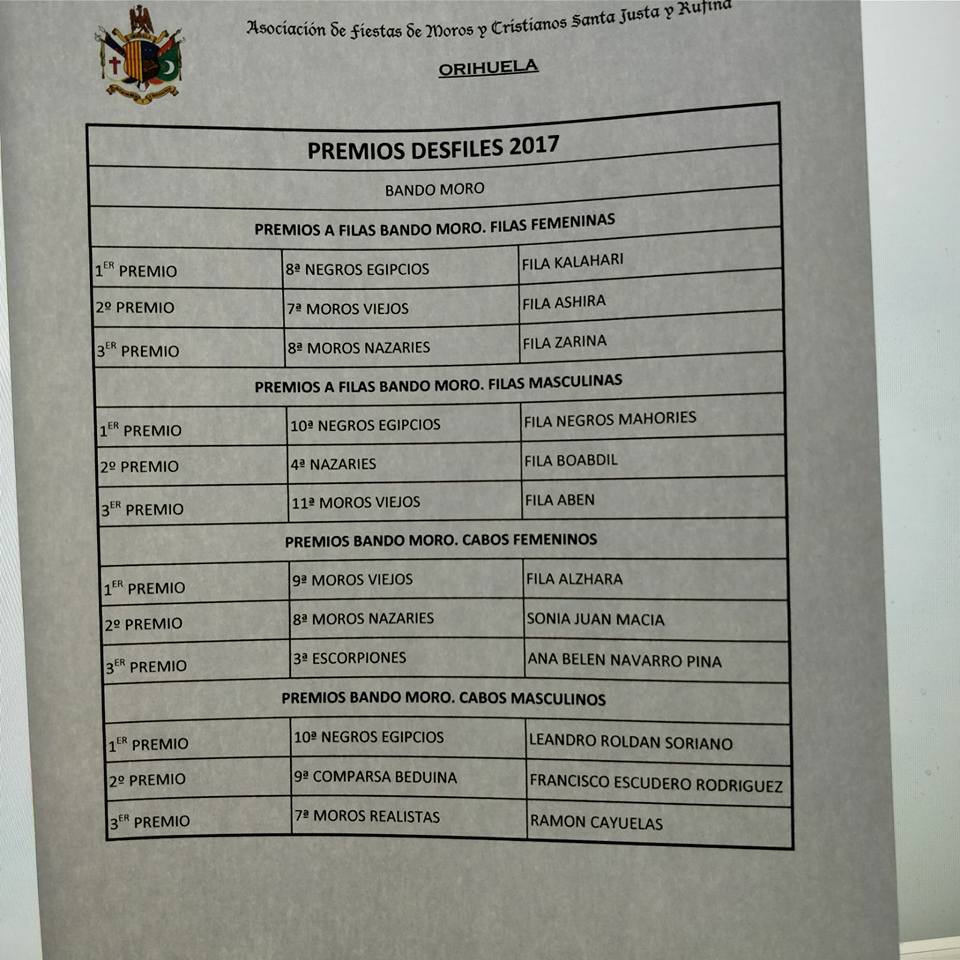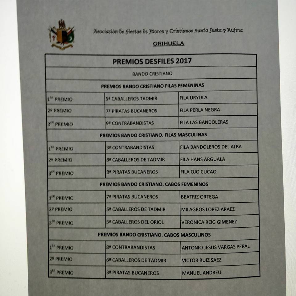 La Asociación de Fiestas «Santas Justa y Rufina» ha hecho público el listado de cabos y filas premiados de las Fiestas de Moros y Cristianos 2017, los cuales pueden ver a continuación en las siguientes imágenes.