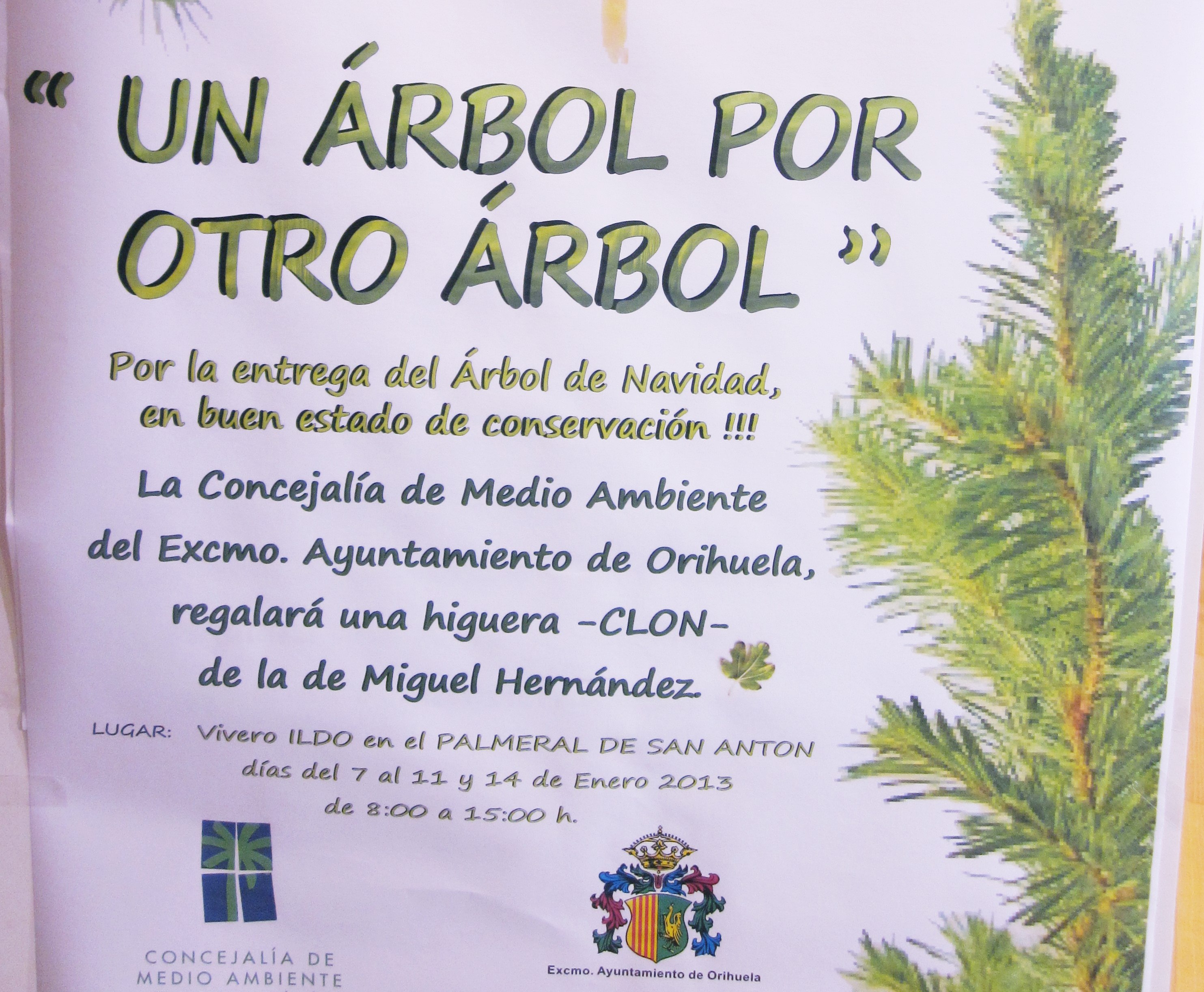 El ayuntamiento de Orihuela ha creado un plan con el que se pretende recuperar los árboles de Navidad en buen estado de los domicilios del municipio para su replantación. La Concejala de Medioambiente, Anunciación Belchí, ha presentado la campaña “1 Árbol por otro Árbol”, con la que se pretende cambiar el abeto por una higuera idéntica a la de Miguel Hernández.