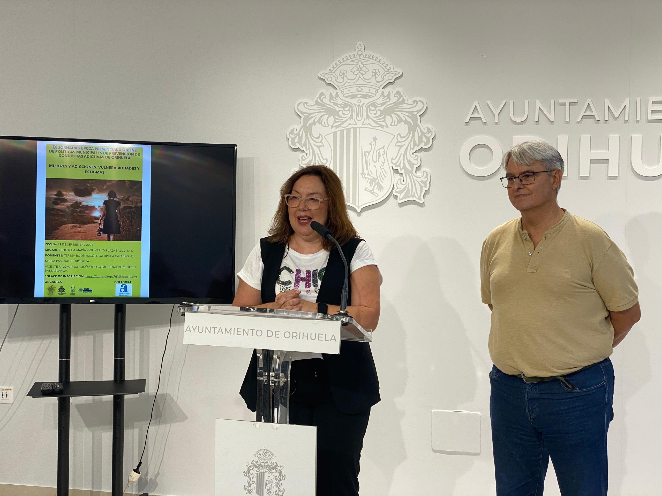 La concejala de Sanidad, Irene Celdrán, ha presentado esta mañana las IX Jornadas UPCCA que tendrán lugar el próximo 19 de septiembre en la Biblioteca Municipal María Moliner a las 17:00h. La edil ha estado acompañada por Álvaro Botella, psicólogo de la Unidad de Prevención de Conductas Adictivas (UPCCA). “Se trata de unas jornadas que serán de carácter presencial u online sobre políticas municipales de prevención de conductas adictivas de Orihuela, que llevan por título “Mujeres y adicciones:vulnerabilidades y estigmas”,tal y como ha avanzado la edil oriolana.