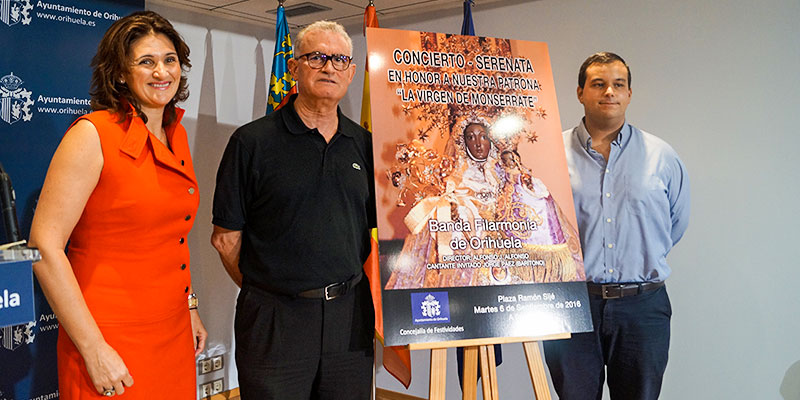 La concejal de Festividades, Mariola Rocamora, presentó este viernes los actos previstos para la celebración de las fiestas patronales de la ciudad en honor a la Virgen de Monserrate, que tendrán lugar la próxima semana. Así, la edil destacó que desde el Ayuntamiento se ha organizado un concierto-serenata el próximo martes 6 de septiembre, a las 21.30 horas en la Plaza Ramón Sijé, a cargo de la Banda Filarmonía de Orihuela (Acamdo), dirigida por Alfonso Alfonso, mientras que también “disfrutaremos de la actuación del barítono Jorge Páez, quien nos deleitará con un amplio repertorio musical”, aseguró Rocamora. El concierto tendrá lugar posteriormente de la tradicional romería en la que “los oriolanos arropamos a la patrona en su traslado desde el santuario hasta la catedral”.