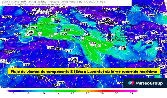 La configuración atmosférica prevista para las próximas horas viene de la mano de una pequeña DANA (Depresión Aislada en Niveles Altos) que en las inmediatas horas se ubicará sobre el sureste peninsular. Más tarde, de cara al viernes por la tarde, otra DANA, de mayor extensión se ubicará en el norte del continente africano. Entre ambas perturbaciones, formarán un compendio de centros de bajas presiones que favorecerán que el viento de componente E (Este o Levante) tenga un larguísimo recorrido marítimo, partiendo desde Grecia hasta llegar al litoral de las provincias de Valencia, Alicante, Murcia y Almería. Este flujo se traduce en un “río atmosférico” que arrastrará una masa de aire inestable con índices de humedad muy elevados, dando lugar a una clara alteración de la situación marítima.
