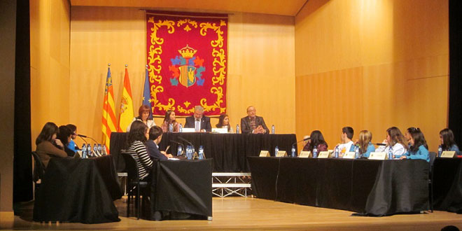 Tras ceder el alcalde su puesto y entregar la vara de mando a Gabriela, los alumnos de los cinco colegios han procedido a dar lectura de su trabajo en clase sobre los artículos 12 y 18 de la convención, que hacen referencia al derecho de los niños a la participación y la educación, respetivamente, y han formulado sus preguntas a los concejales Emilio Zaplana y Rosa Martínez.