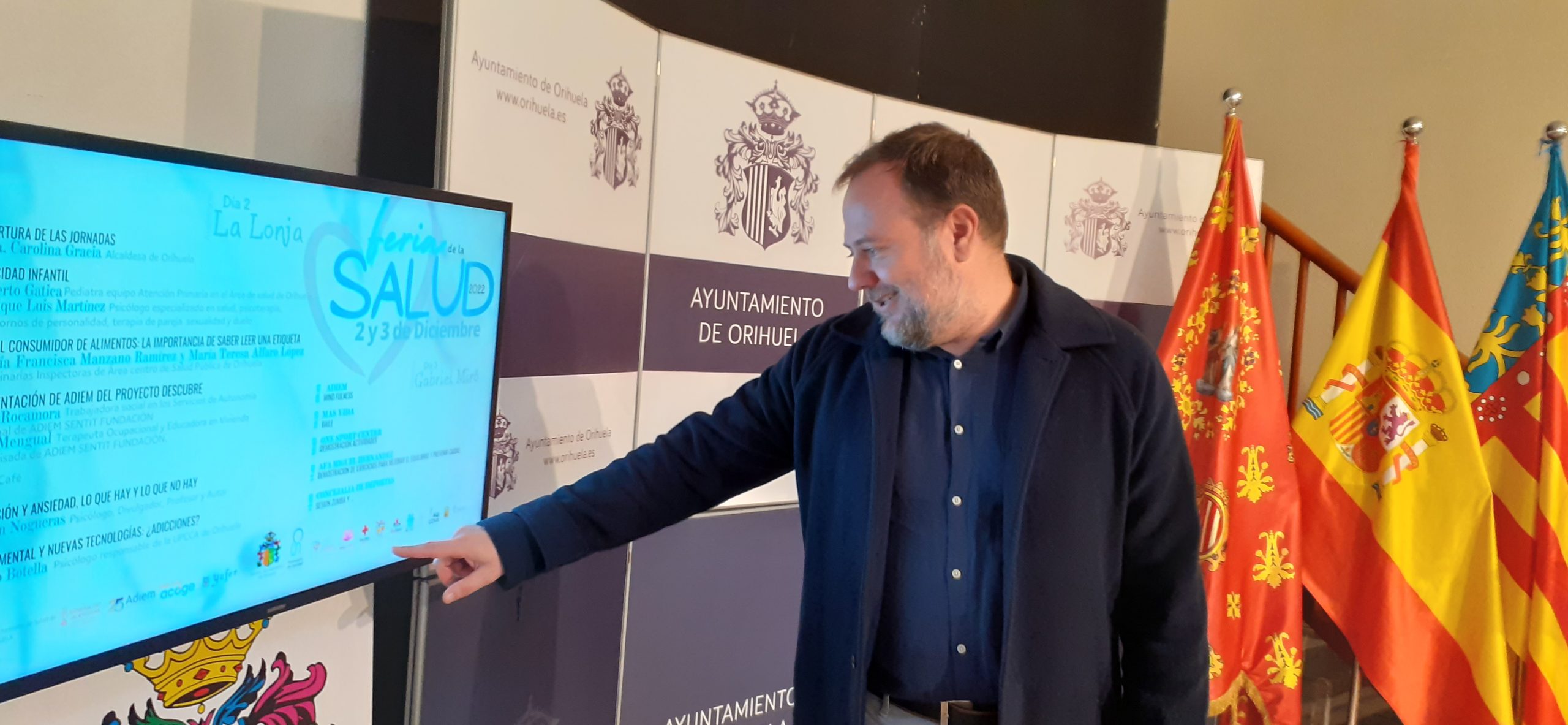 El concejal de Sanidad, Luis Quesada, ha presentado hoy las actividades que se desarrollarán en el marco de la Feria de la Salud, que se celebrará los días 2 y 3 de diciembre y que tienen como objeto “la promoción de la salud y la prevención de la enfermedad”. Así, a las 9 horas del sábado 2 de diciembre, la alcaldesa, Carolina Gracia, será la encargada de abrir las jornadas en el auditorio La Lonja, donde, a lo largo de la mañana, tendrán lugar distintas ponencias relacionadas con la salud. De este modo, a las 9.15 horas, Alberto Gatica y Enrique Luis Martínez, pediatra y psicólogo respectivamente, hablarán de obesidad infantil; a las 10 horas, las veterinarias inspectoras del área del centro de salud pública de Orihuela María Francisca Manzano y María Teresa Alfaro impartirán una conferencia sobre la importancia de saber leer las etiquetas de los alimentos; a las 10.45 horas, Sara Rocamora y Ana Mengual, de Adiem Sentit Fundación, hablarán sobre el proyecto “Descubre” de la asociación; a las 11.45 horas, el psicólogo Ramón Nogueras pronunciará la conferencia “Depresión y ansiedad. Lo que hay y lo que no hay” y, a las 13 horas, Álvaro Botella, psicólogo y responsable de la Unidad de Prevención de Conductas Adictivas (UPCCA) de Orihuela se encargará de la ponencia “Salud mental y nuevas tecnologías. ¿Adicciones?”.