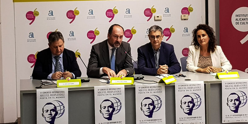El alcalde de Orihuela, Emilio Bascuñana, presentó este viernes el IV Congreso Internacional Miguel Hernández poeta en el mundo junto al director del Instituto Alicantino de Cultura Juan Gil-Albert, José Ferrándiz; José Luis Ferris, codirector de la Cátedra Miguel Hernández de la UMH, y la directora del Centro de Estudios Iberoamericanos Mario Benedetti.